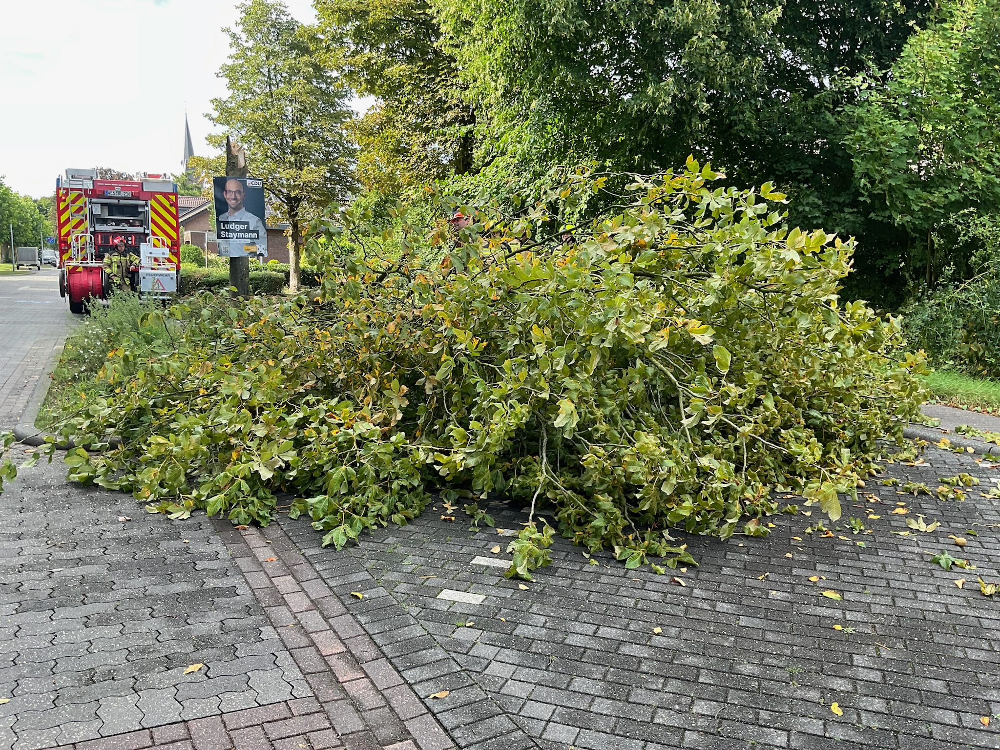 Ein Baum war auf den Gehweg und angrenzenden Parkplätze gestürzt. Die Einsatzstelle wurde gegen den fließenden Verkehr abgesichert und der Baum mithilfe einer Kettensäge zerkleinert. Abschließend befreiten die Einsatzkräfte den Gehweg und die Parkplätze von Geäst und Schmutz.