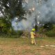 Vor Ort brannte eine Hecke an einer Hausfassade. Ein Trupp unter umluftunabhängigem Atemschutz ging mittels C-Rohr zur Brandbekämpfung vor. Des Weiteren wurde die angrenzende Wohnung kontrolliert. Das stark verrauchte Dachgeschoss wurde quergelüftet und mit der Wärmebildkamera auf vorhandene Glutnester abgesucht. Parallel dazu wurde die Dachhaut von außen mit der in Stellung gebrachten Drehleiter und einem Trupp ebenfalls ohne weitere Festellungen kontrolliert.