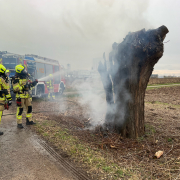 Beim Eintreffen der Einsatzkräfte brannte eine Kopfweide in voller Ausdehnung. Ein Trupp unter umluftunabhängigem Atemschutz unternahm die ersten Löschmaßnahmen mittels S-Rohr. Im weiteren Einsatzverlauf wurden Baum dann mittels Motorsäge gefällt und anschließend mit Löschschaum abgelöscht.