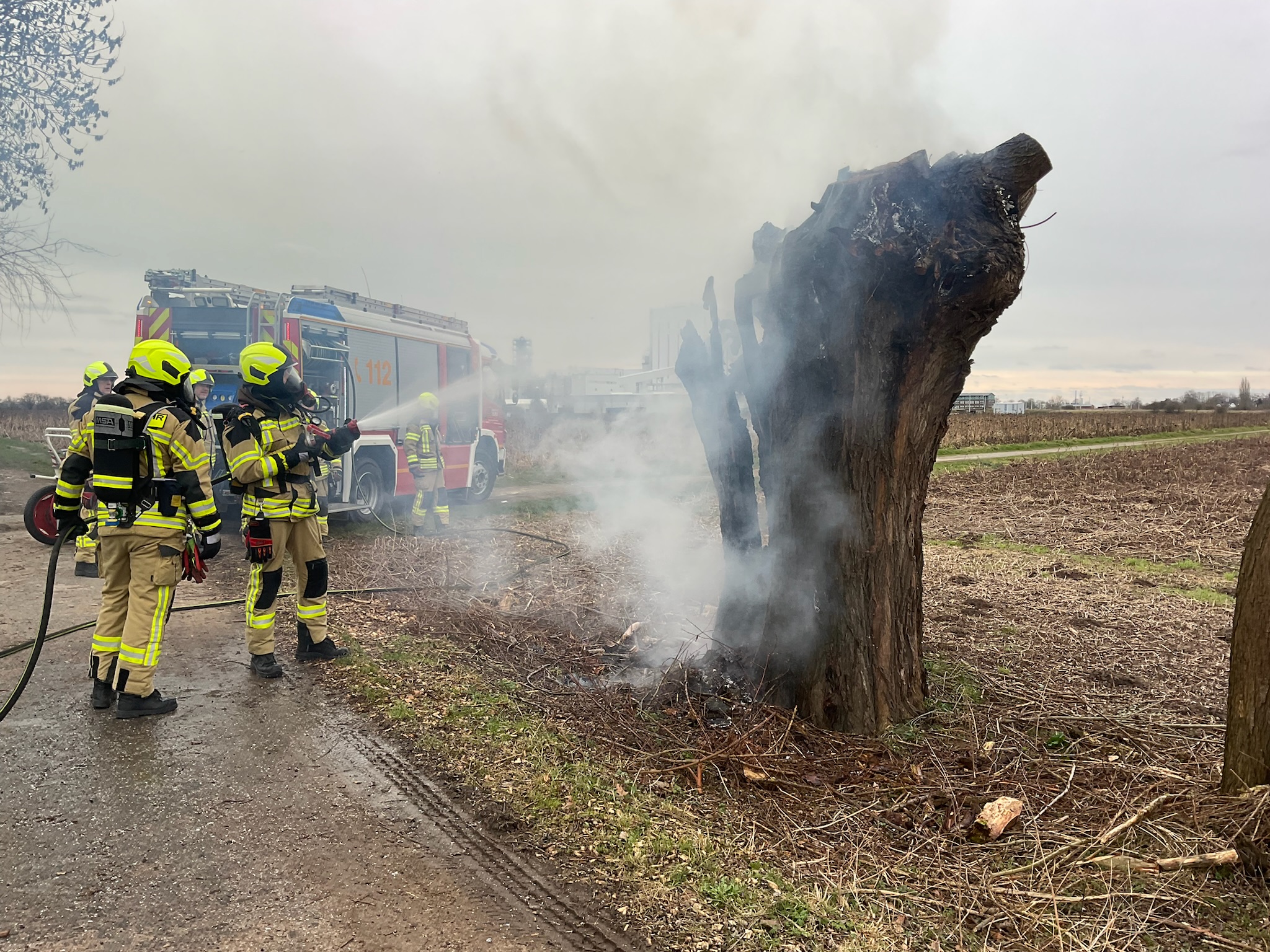 Beim Eintreffen der Einsatzkräfte brannte eine Kopfweide in voller Ausdehnung. Ein Trupp unter umluftunabhängigem Atemschutz unternahm die ersten Löschmaßnahmen mittels S-Rohr. Im weiteren Einsatzverlauf wurden Baum dann mittels Motorsäge gefällt und anschließend mit Löschschaum abgelöscht.